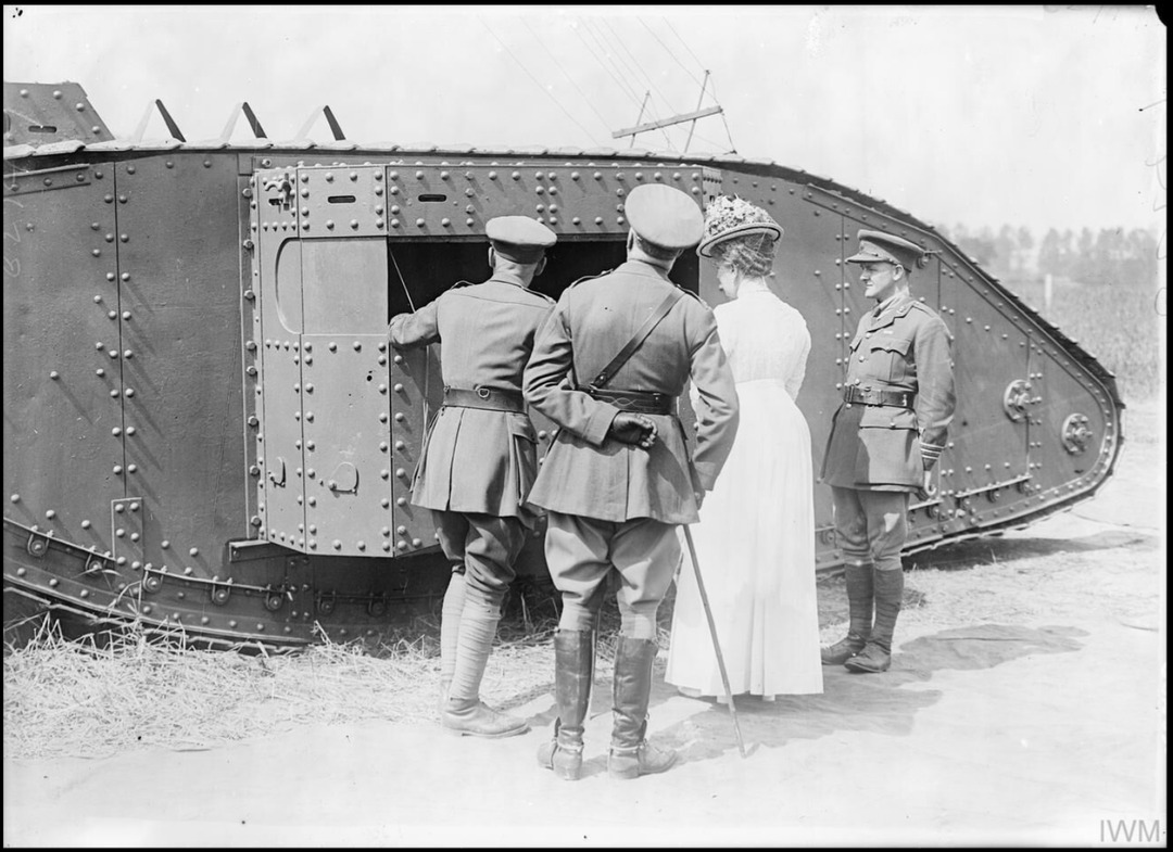 Queen Mary of Teck inspecting tanks and personnel at the Tank Corps Central Stores and Workshops at Erin, 7 July 1917. General Hugh Elles, the Commander of the Tank Corps, and Anthony Ashley-Cooper, 9th Earl of Shaftesbury, can be seen in the background, on her right.